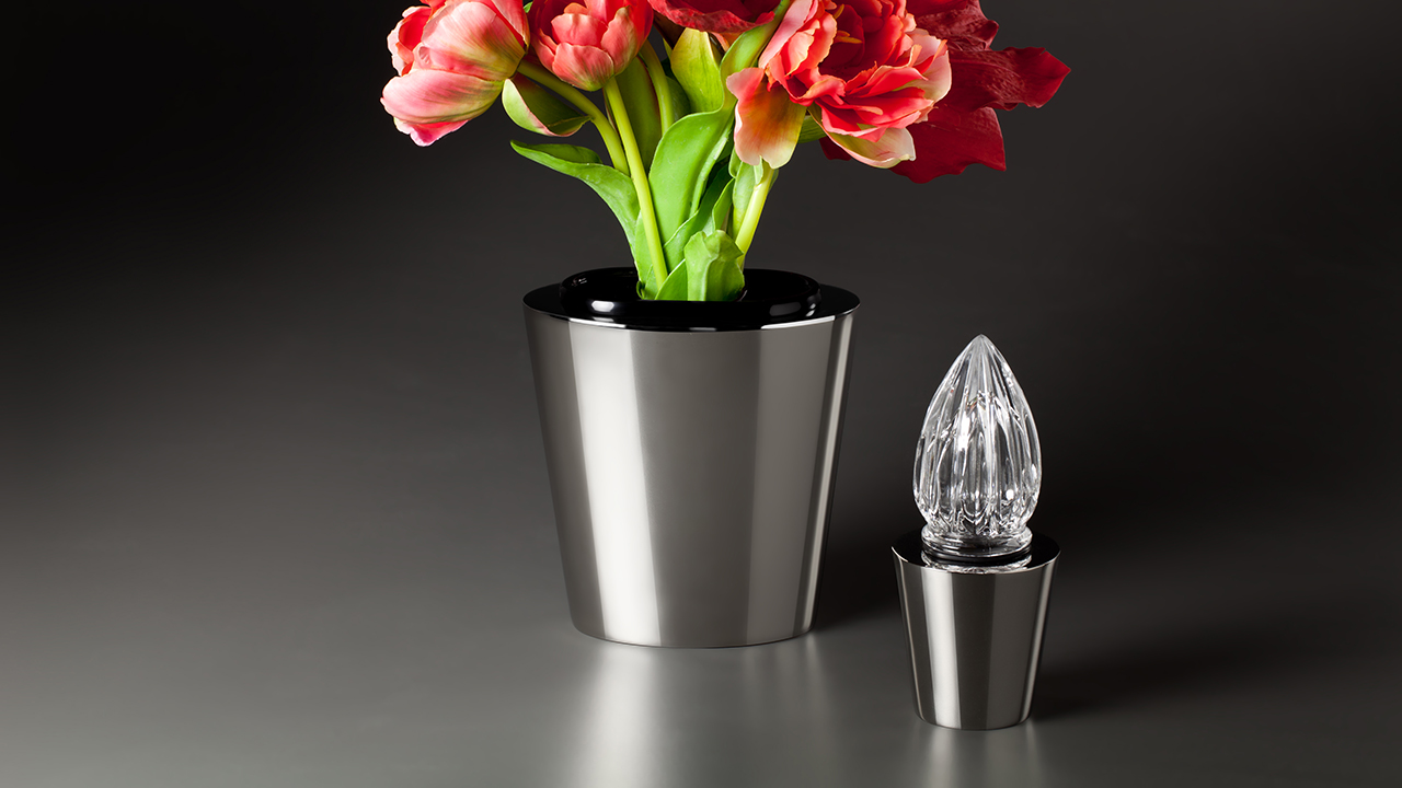 A sparkling of lights and reflects. Contrasts which involve , regular and perfectly symmetrical shapes for a timeless and simple elegance. The stainless steel naturally enhances with no excess but adding brightness to votive lamps and flowers vases.